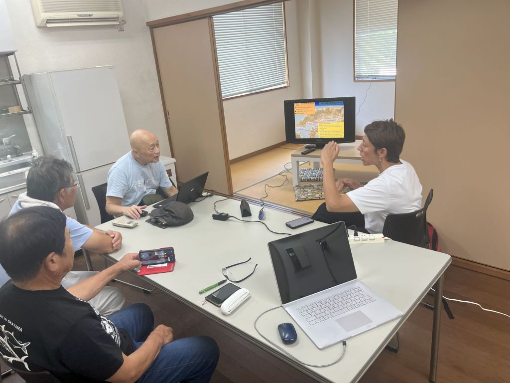 白石島新港学術利用協会 顧問 田中さんより、白石島で行ってきた海洋牧場におけるポイントと、その費用対効果についての説明をいただき、そして、事務局より白石島新港海洋研究所の紹介と、現在の白石島新港の再開発ビジョンについて紹介しました。