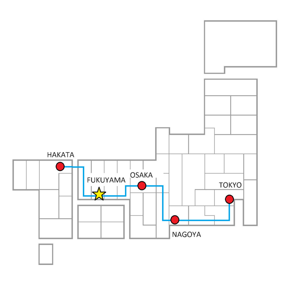 東京 → (新幹線) → 福山 約3時間30分