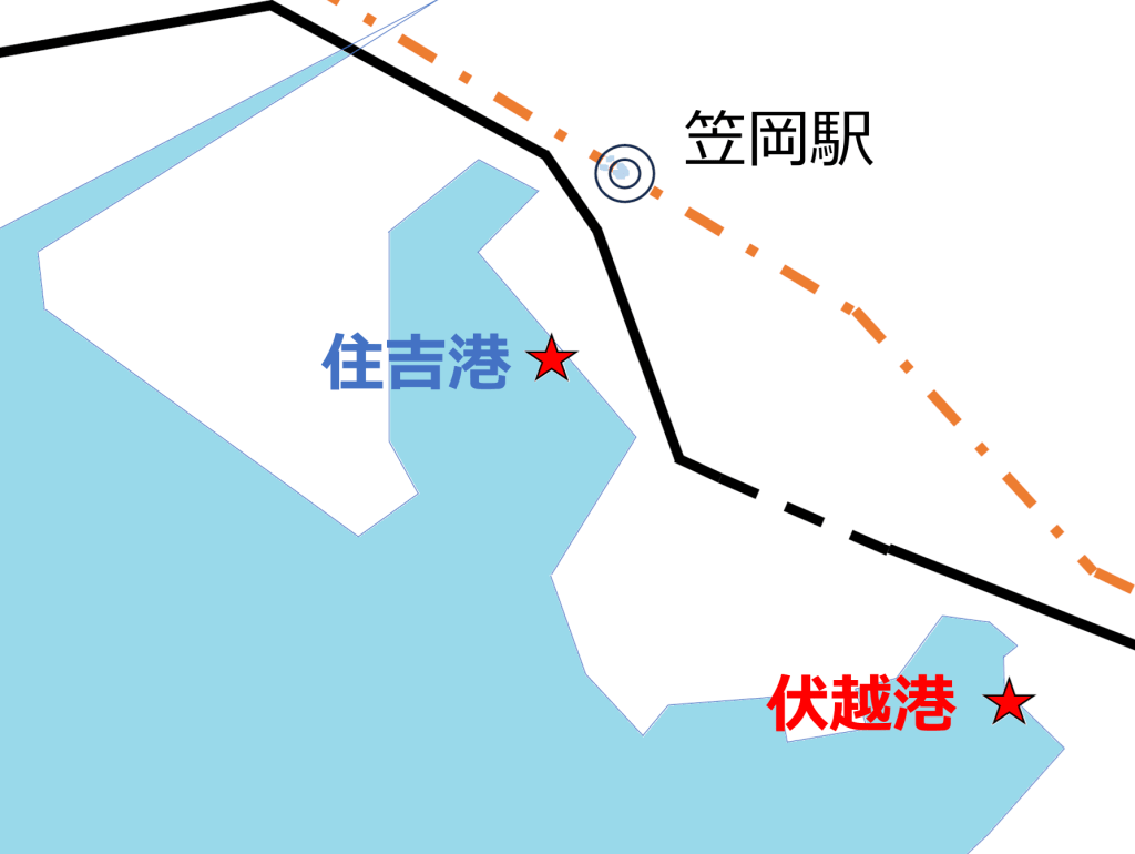 笠岡駅から徒歩15分。定期船・高速船乗り場の、住吉港から
