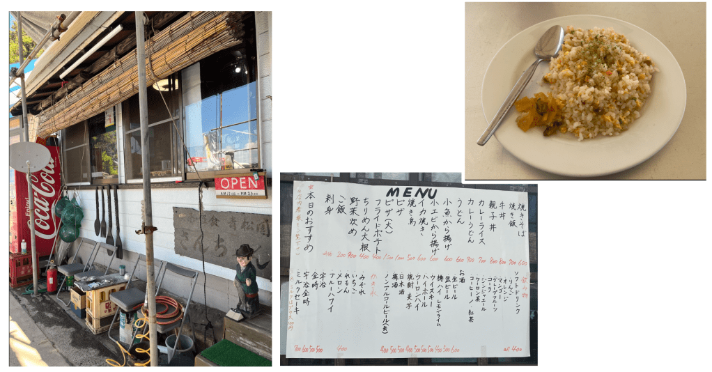 昼食時と夕方以降の営業で、お食事は、一般的なカレー、うどん、焼き飯等、おつまみは、雑魚のから揚げ、焼き鳥、野菜炒め等があり、お酒も扱っています。事前予約で、テイクアウト、宴会やバーベキューも可能です。~21:00までの営業です